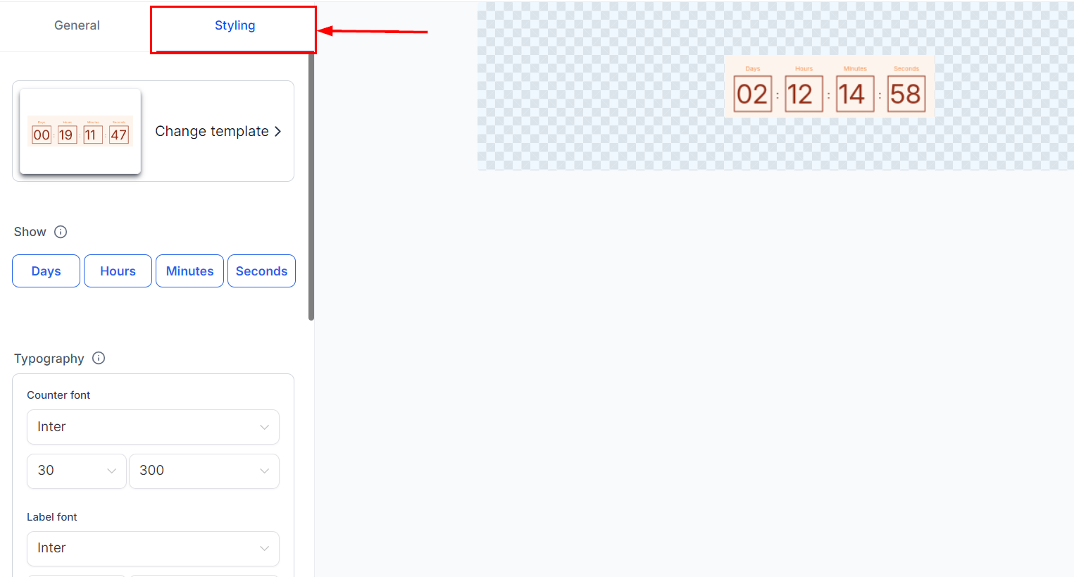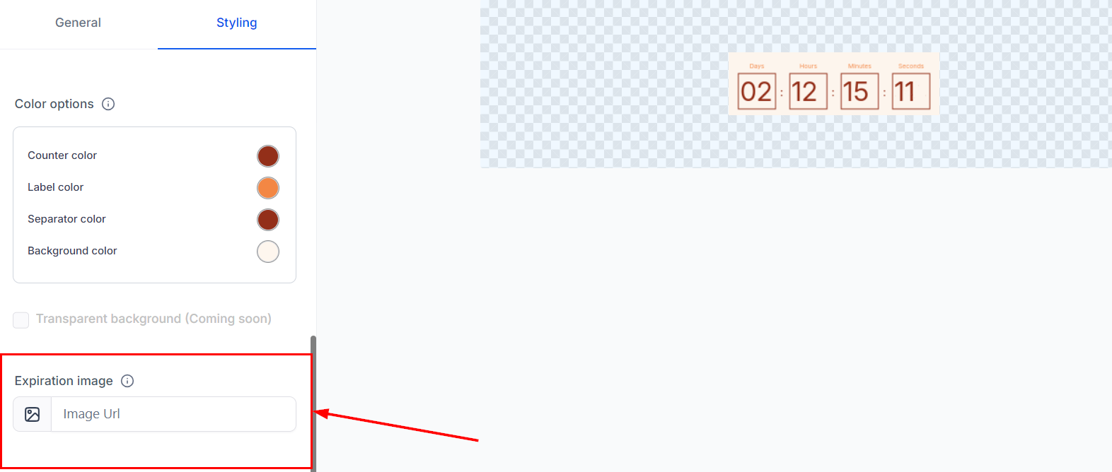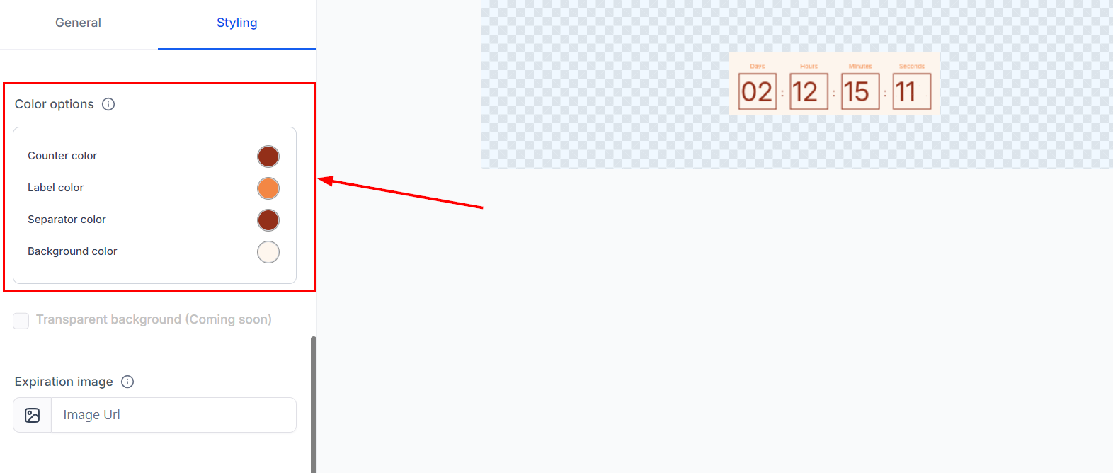 Navigate to this tab to adjust the timer’s appearance, including colors, fonts, expiry images, and time display format.