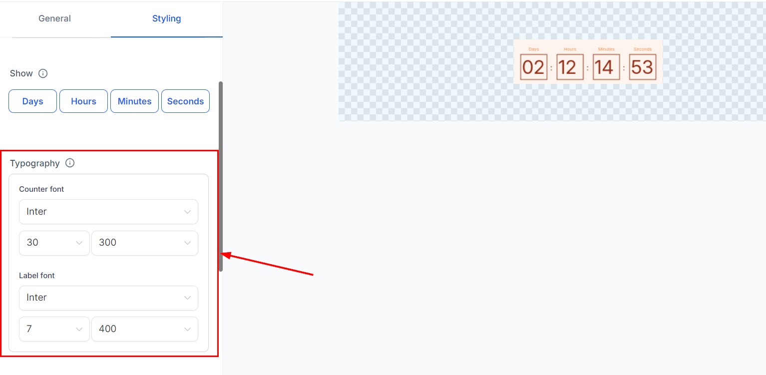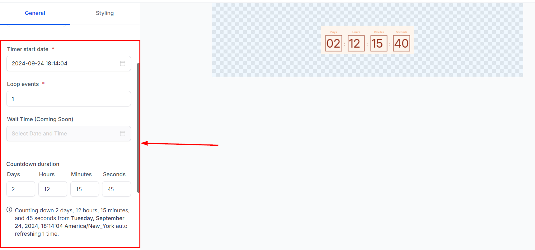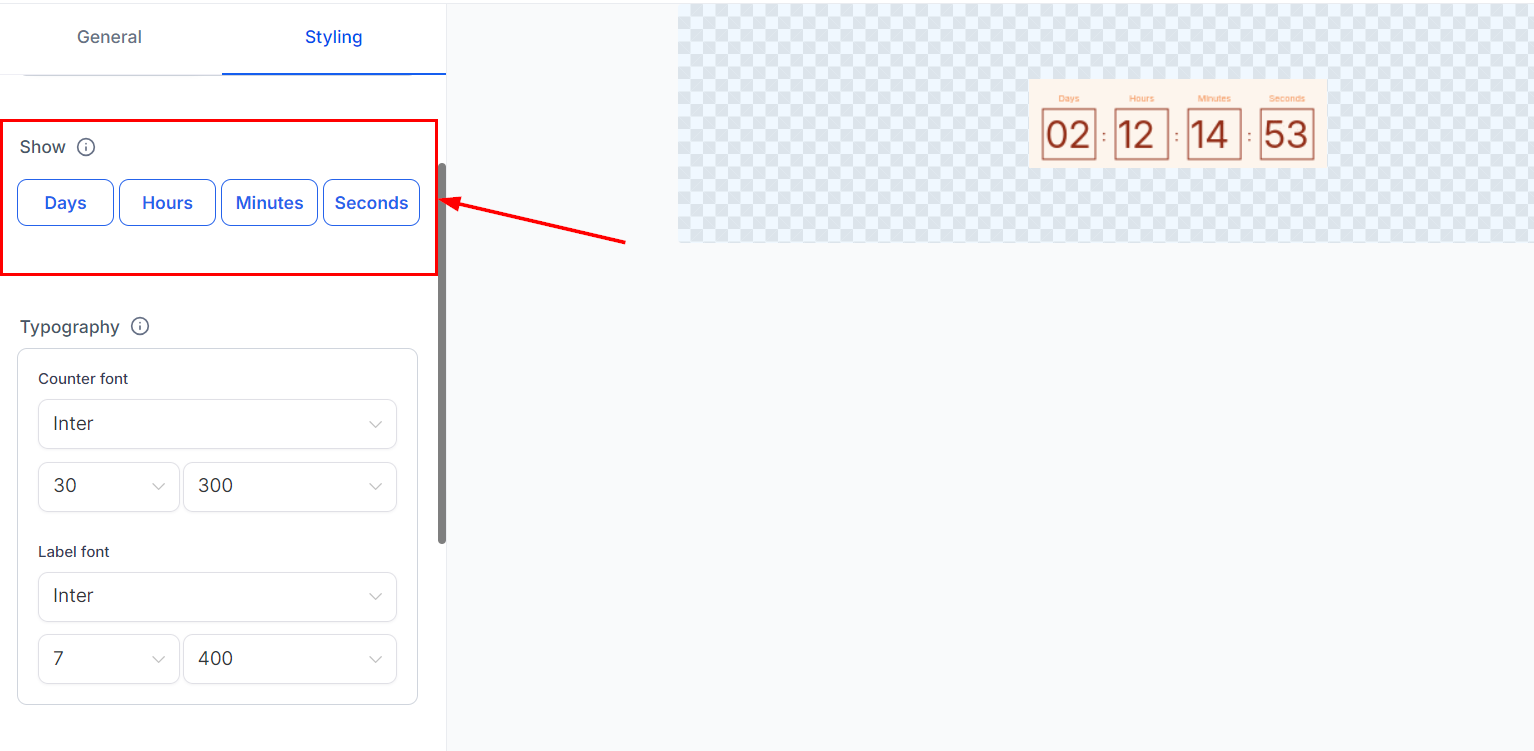 Navigate to this tab to adjust the timer’s appearance, including colors, fonts, expiry images, and time display format.