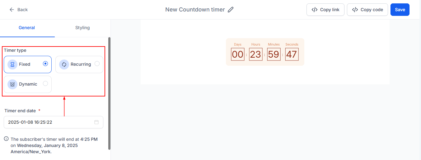 Select the type of timer you want: Fixed, Recurring, or Dynamic.