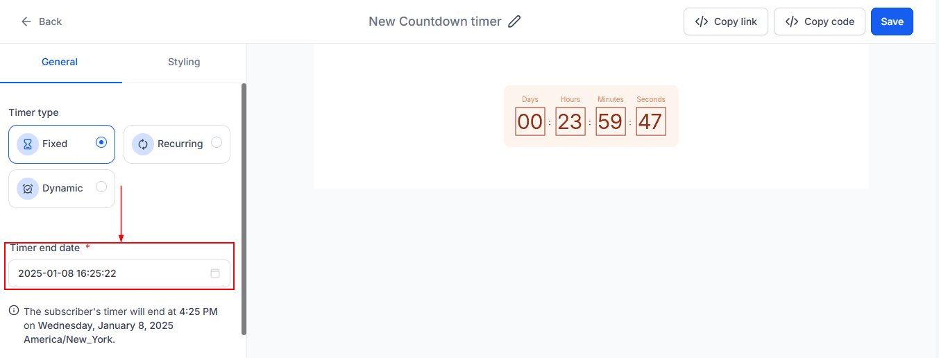 - Fixed Timer: Counts down to a set date and time. Ideal for holiday sales or product launches. For instance, “Sale ends in 2 days!”