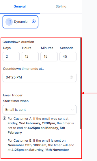 - Dynamic Timer: Personalizes the timer for each contact based on actions like email sent or opened. Example: “Your special offer expires in 1 hour” (based on individual user behavior).