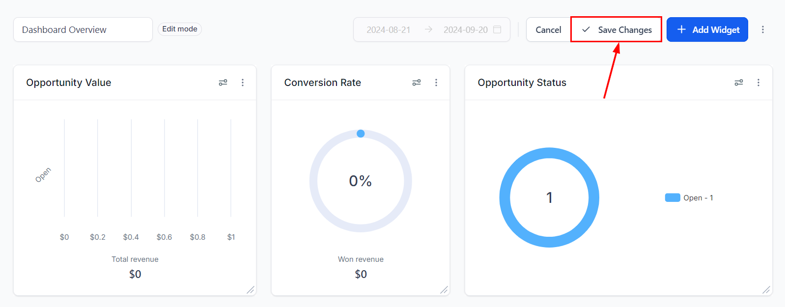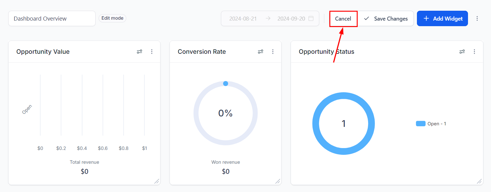 If you change your mind or wish to revert to the previous layout, click "Cancel" to undo your changes. Your widgets will smoothly return to their original configuration, allowing you to reset the dashboard with ease.