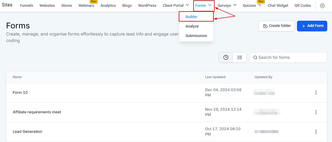 Within your CRM, locate the "Sites" section. From there, hover on the "Forms" option and then click on "Builder."