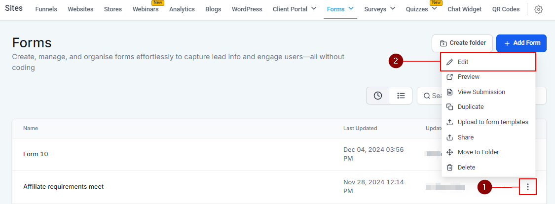 Choose the form you wish to edit, click on the three-dotted option, then select on the "Edit" button. This will open the form in the editing mode.