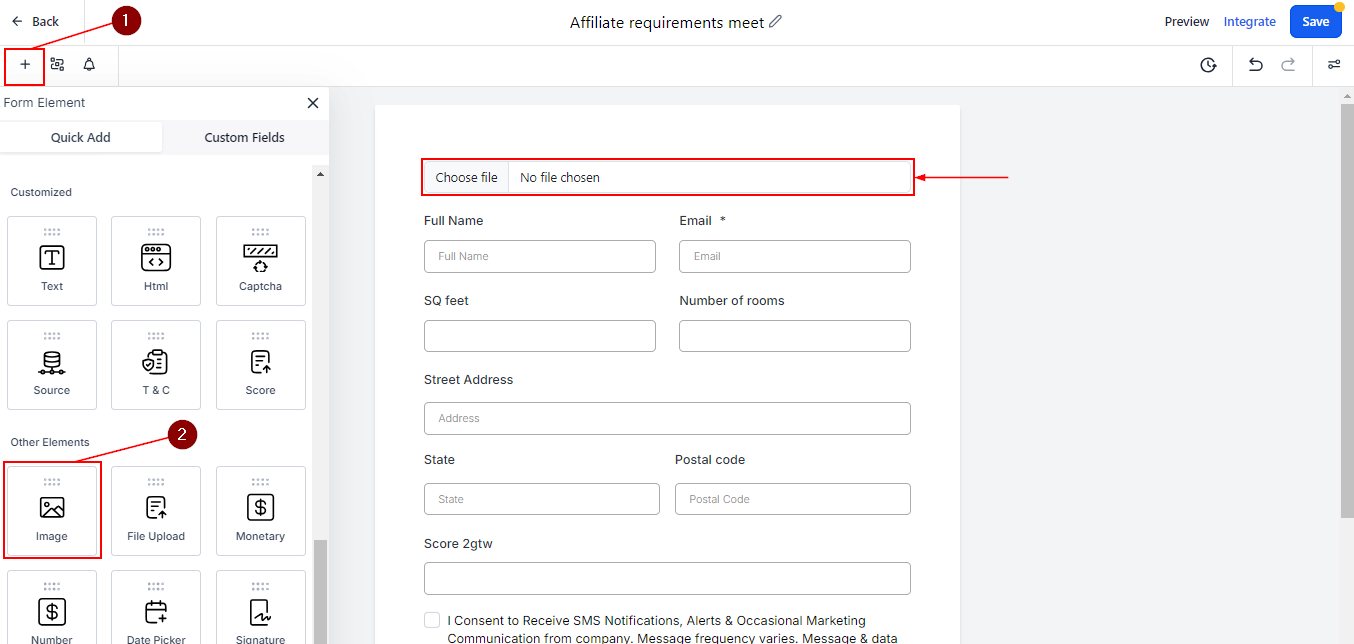 In the form editor, click on the “+” Icon, and drag and drop the image element into your design. Place the image element where you want it to appear in the form layout.