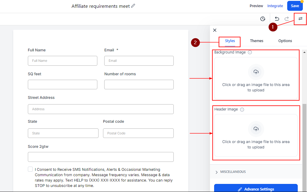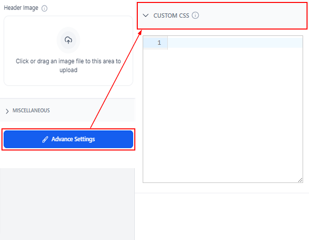 Still, within the Styles and Options section, click on Advance settings, and scroll down to the "Custom CSS" section. Here, you can upload CSS codes for background images.