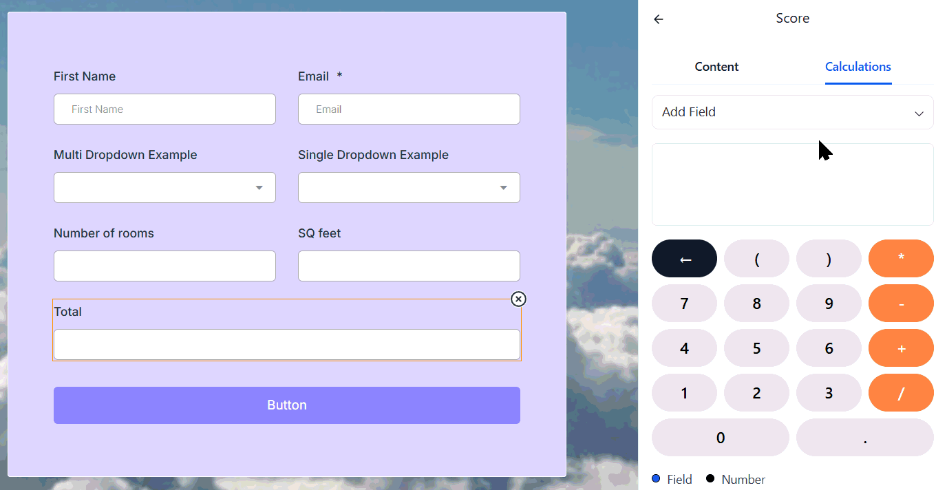 To set the formula the score element will follow, start by entering a number or field, selecting an operator, and entering a second number or field.