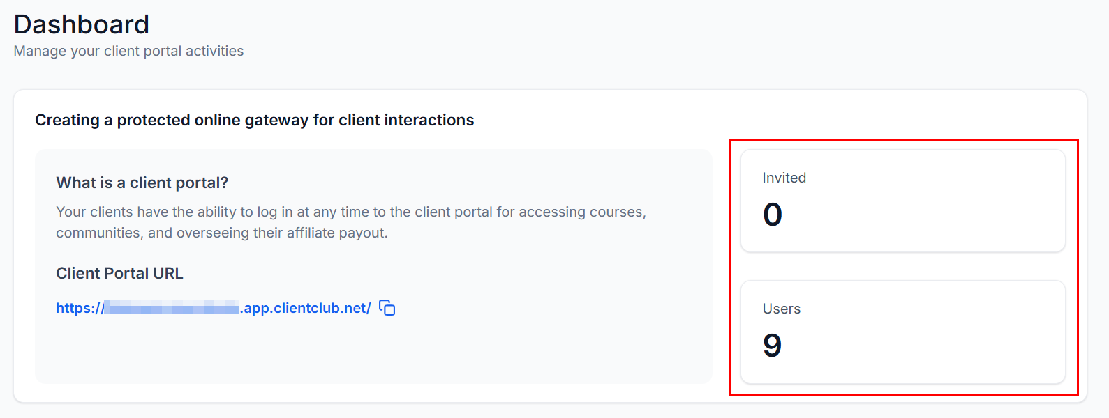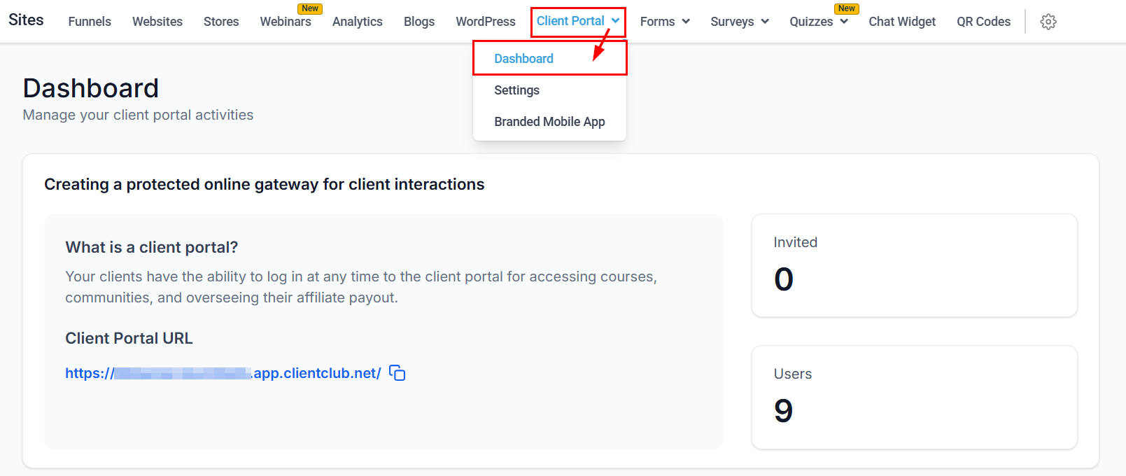 The client portal dashboard offers a comprehensive view of user activity, including invitations and accepted invites, and provides tools to enhance user engagement and streamline access. Locate this feature from the Sites or Membership tab to begin.