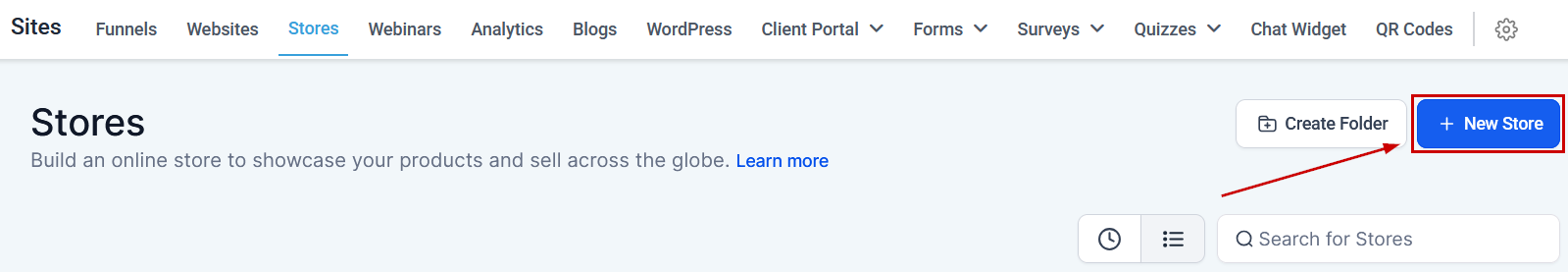 Navigate to the Stores tab within the Sites section of your CRM. Here, you can select the +New option to create your online store.
