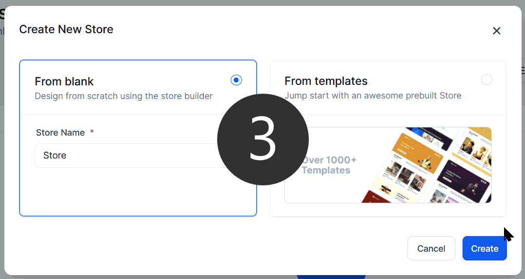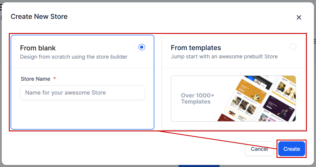 Choose either a blank canvas or a template to customize your e-commerce site, then click Create.