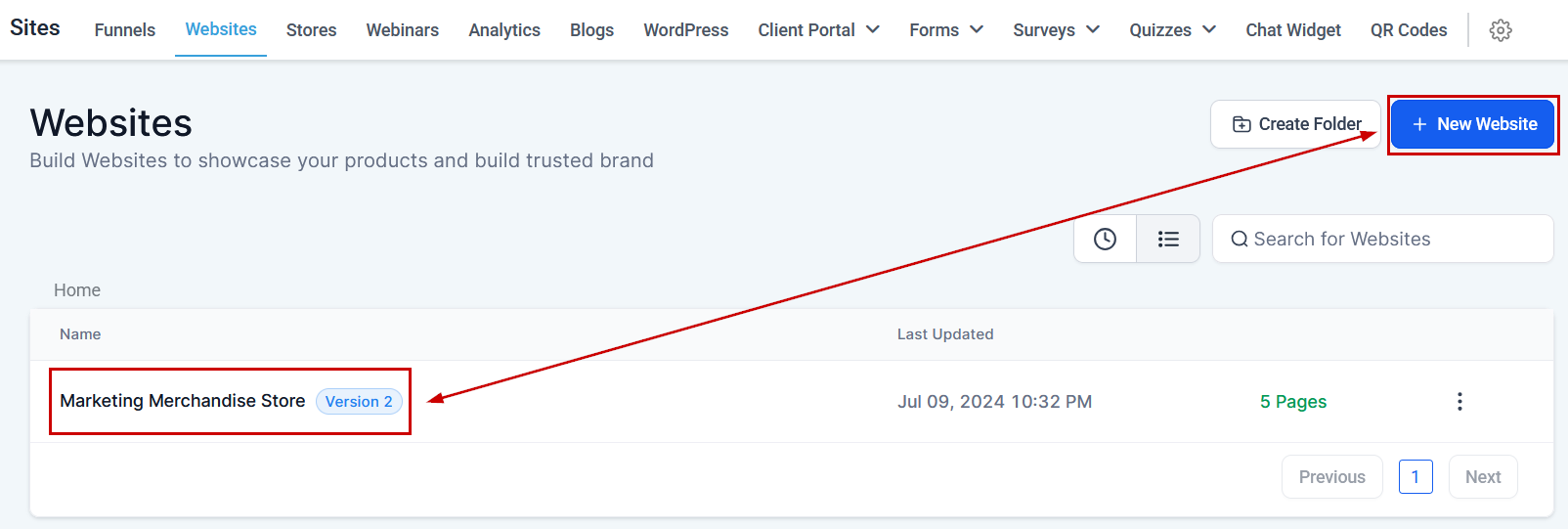 Still, within the Sites section, click on Websites. You can create a new website or pick an already existing website to integrate a store.
