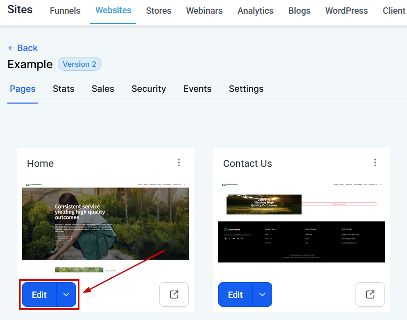 For those websites you created in the past that you decide to make into a store, enter the website builder, select the site, and click Edit on any page.