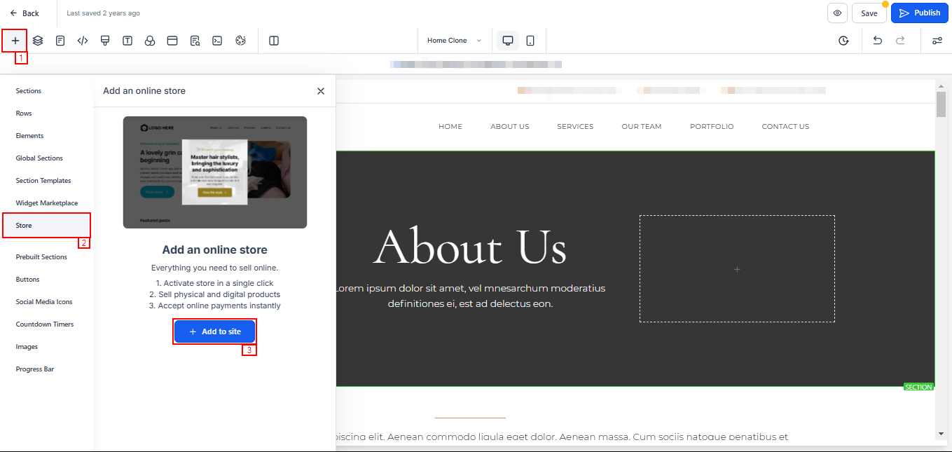 Inside the website builder, look for the “+” icon to access the Add Elements section. Find and click on the Store option, then click on +Add to site. This will enable your site's e-commerce features, allowing you to sell both physical and digital products.