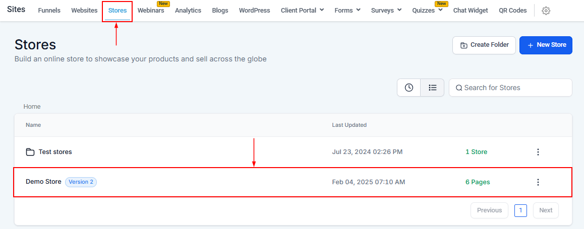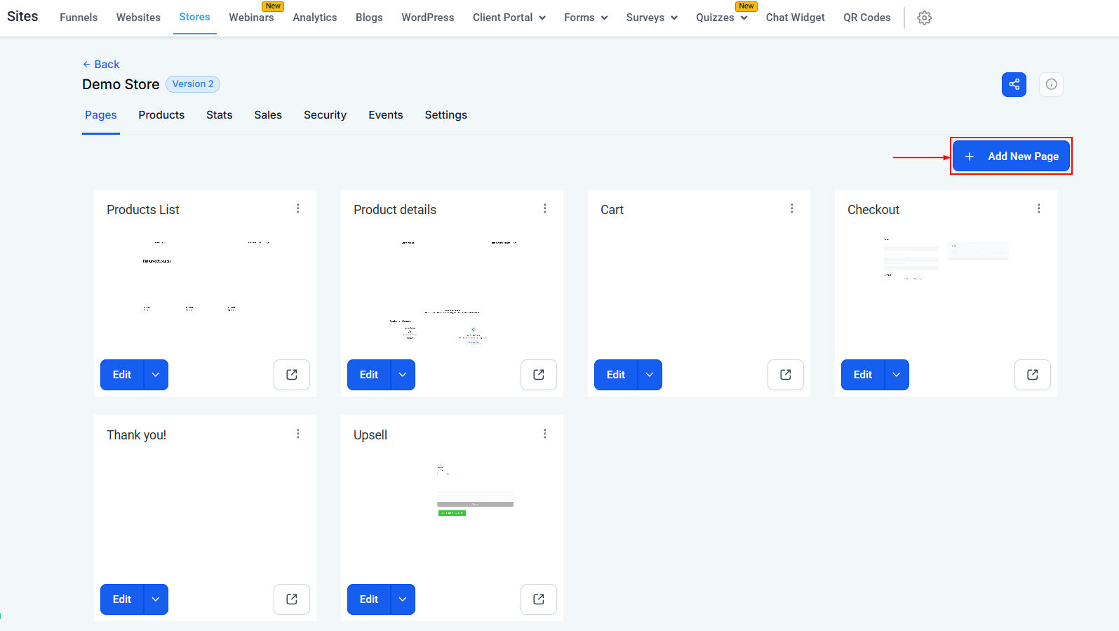 To manage your store’s pages, go to Sites > Stores and select the store you want to update. From here, you can configure your store’s pages to match your business needs.