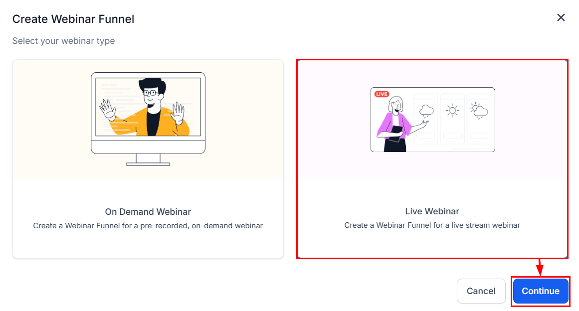 A live webinar funnel enables you to host real-time sessions on scheduled dates and times, providing an interactive platform for you to engage with attendees as the event unfolds. Live webinars require both the host and attendees to participate simultaneously, creating an environment for real-time discussions, Q&A sessions, and feedback.