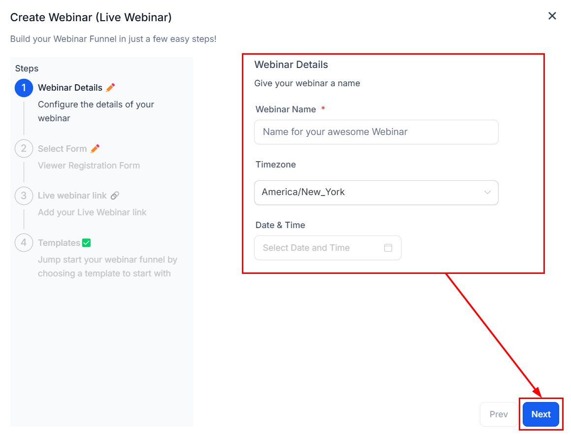 You will then be prompted to provide a name for your webinar in the Webinar Details step. Optionally, you may also set the timezone and date and time for the webinar here.