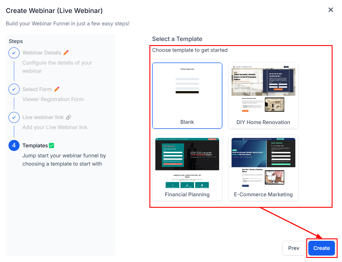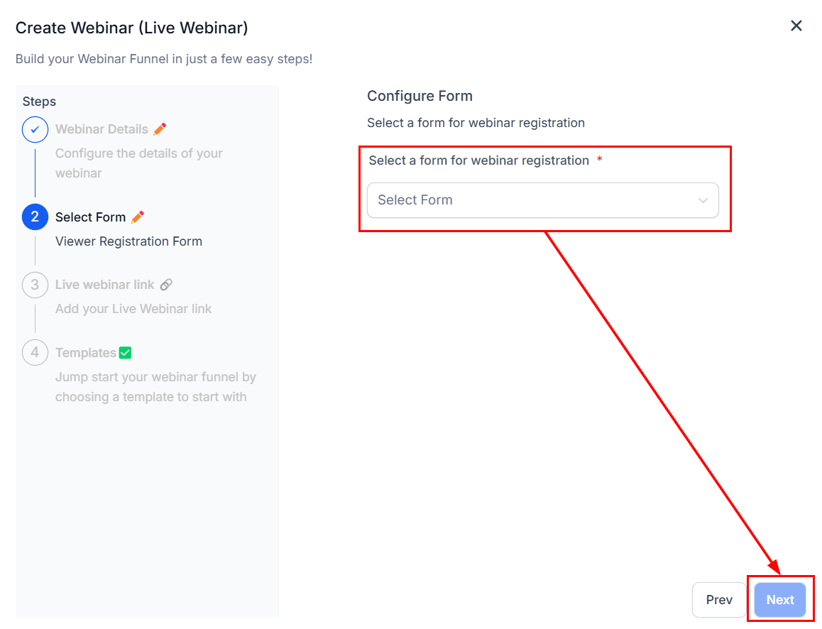 Next, select the form to be used for the webinar registration of your guests, then proceed to the next step.