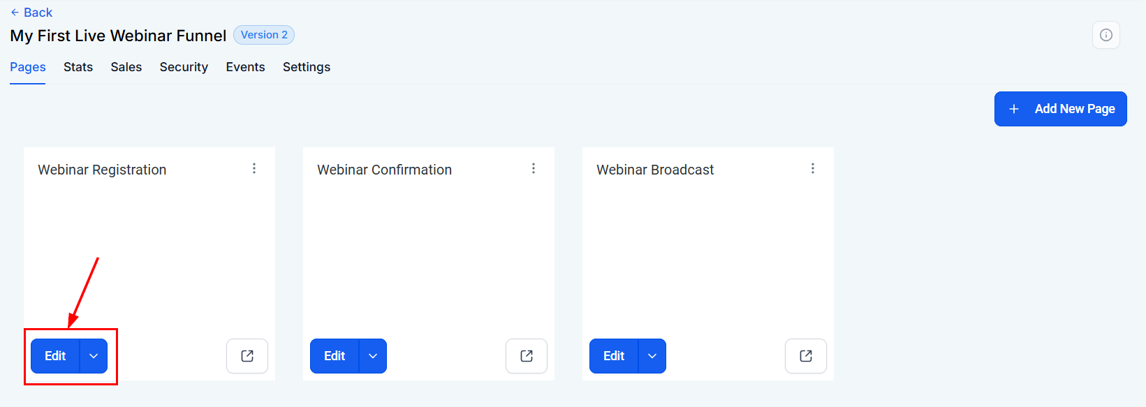 To create a Live Webinar, navigate to the Webinars tab within Sites, then click the New Webinar Funnel option.