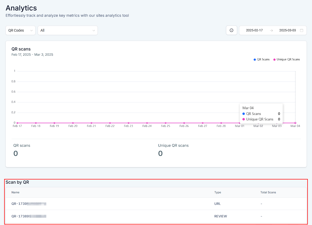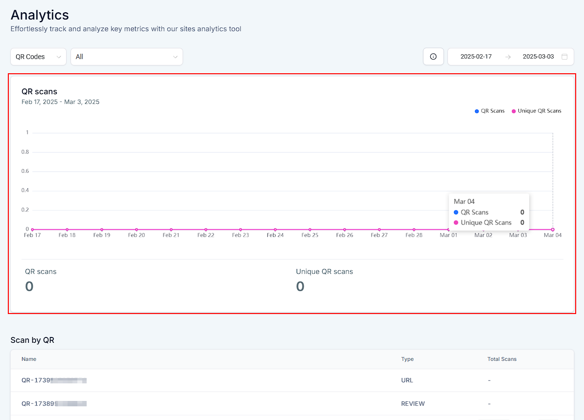 View the total number of QR code scans and the count of unique scans in the graph displayed for the selected time frame.