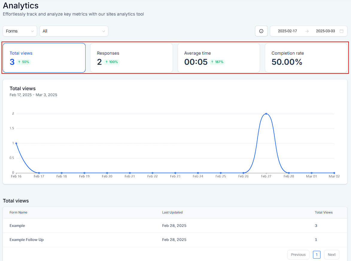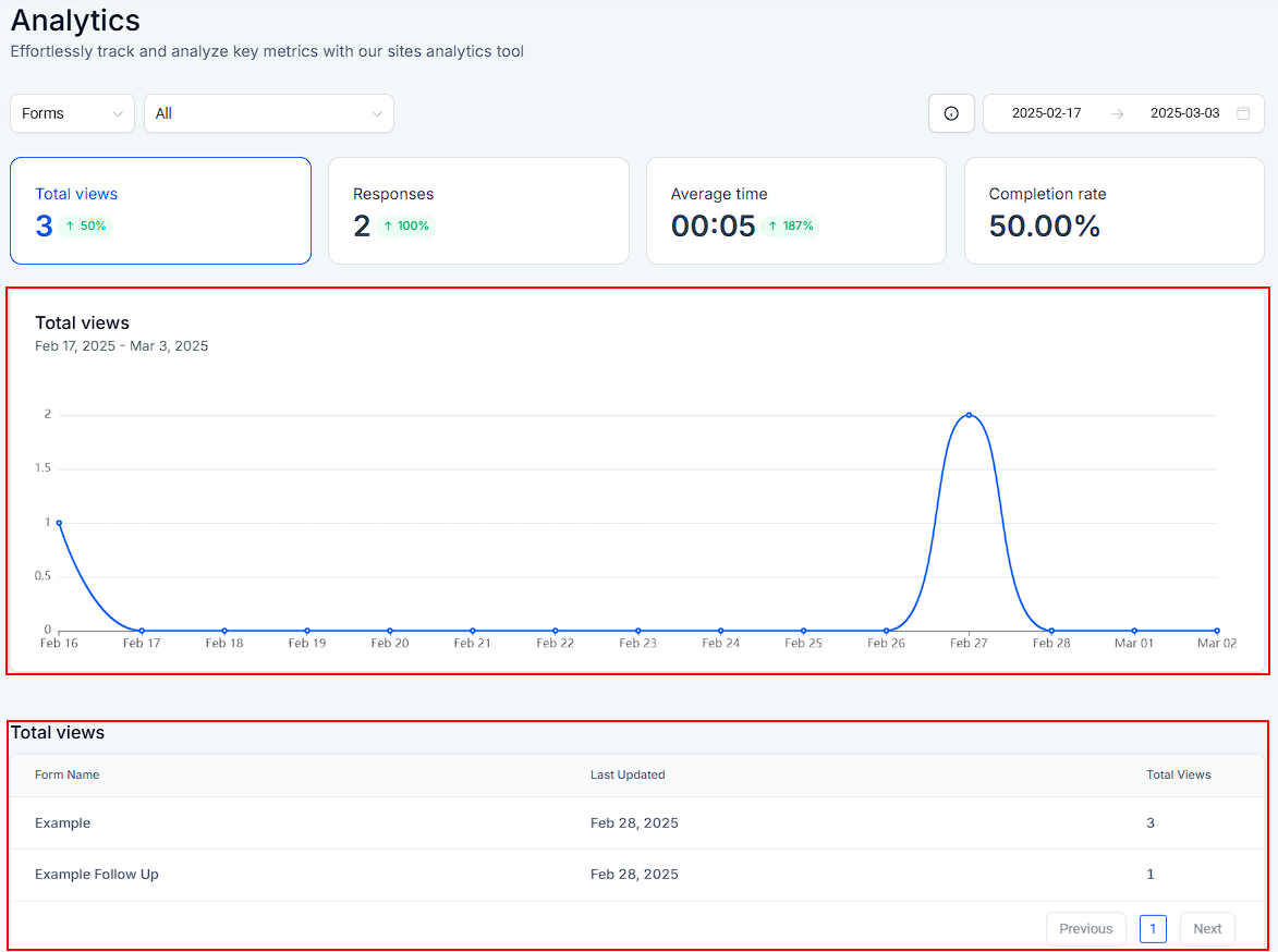 Aside from the numbers provided for you in the metrics section, you can also see a graph view below and also a breakdown of the Form Name, when it was Last Updated, and the Total Views.