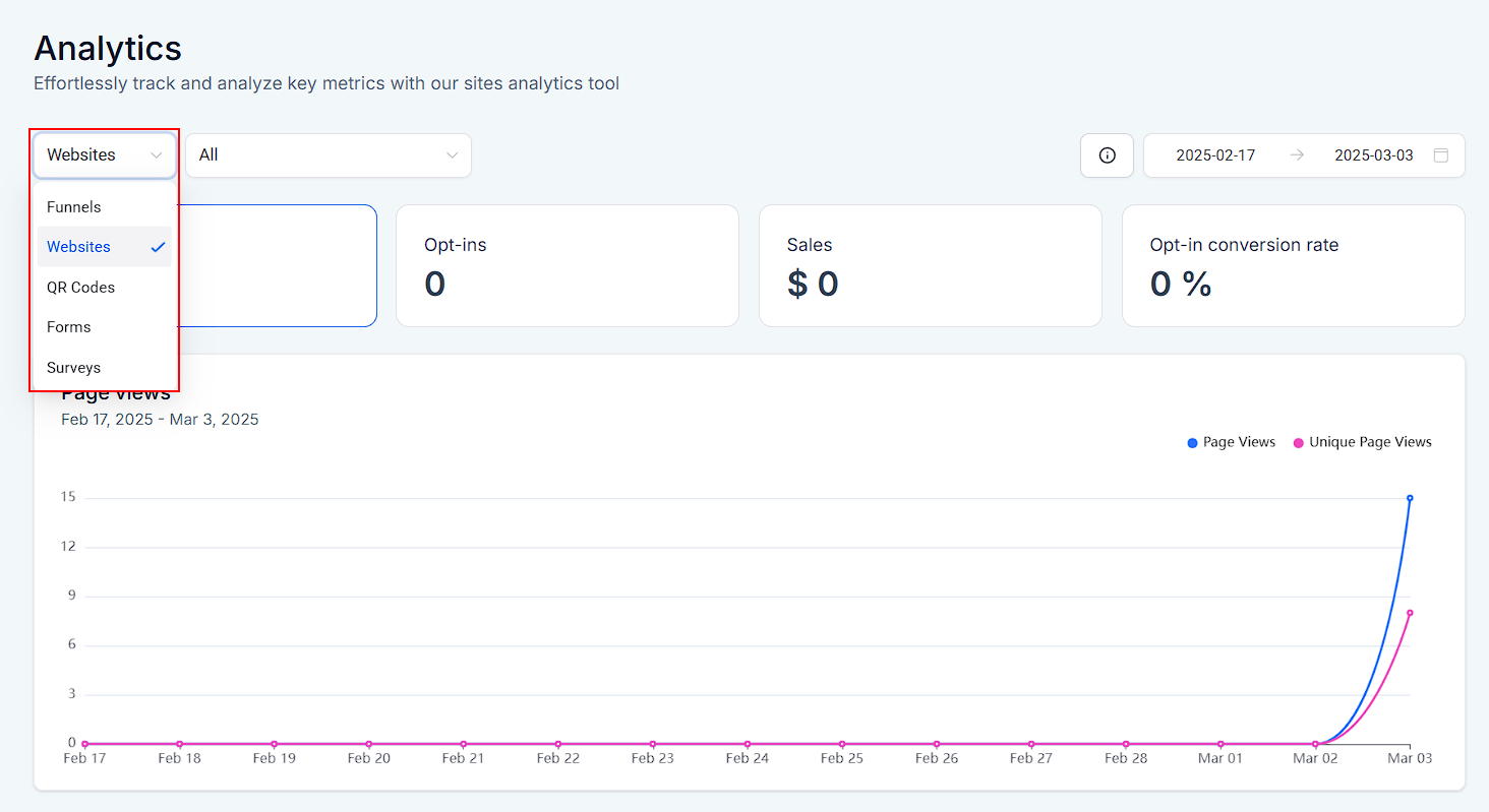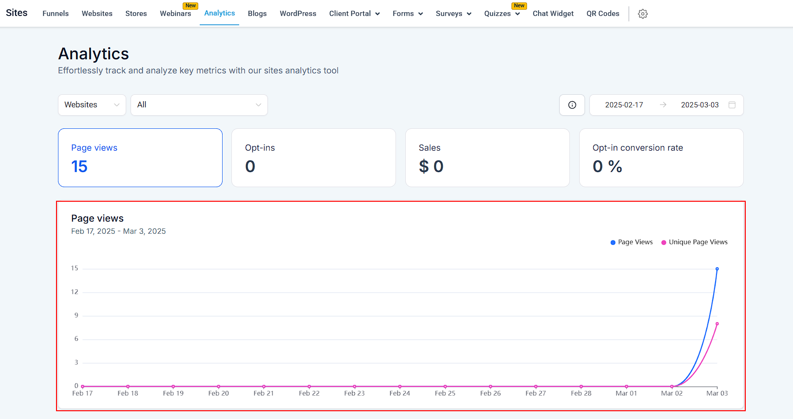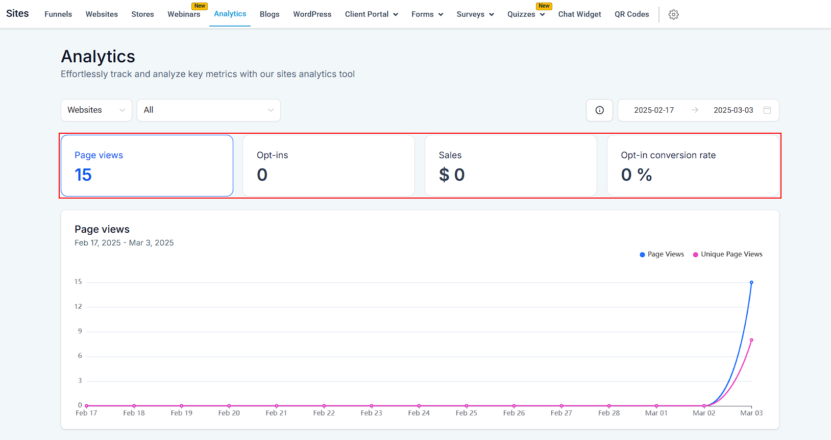 Your Sites Analytics Dashboard helps you track key metrics for your funnels, websites, QR Codes, Forms, and Surveys. This will help you gain a clearer picture of your page views and conversion rates, among other metrics. By understanding these insights, you can spot what’s working and what needs improvement, allowing you to make decisions to increase your online presence.