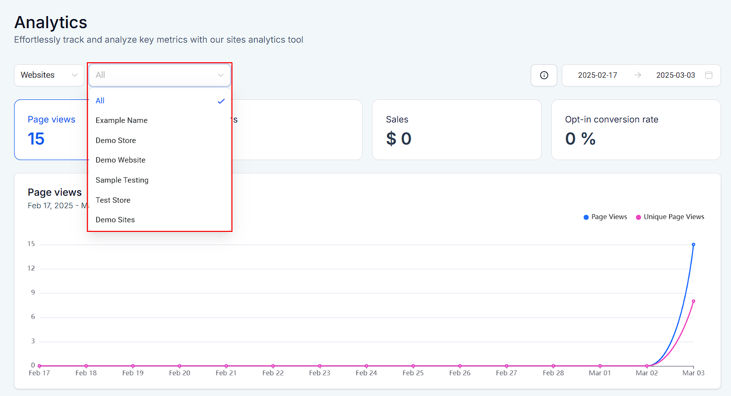 - Page Views: Here, you can see the list of your websites and a chart that shows how much traffic they are attracting.