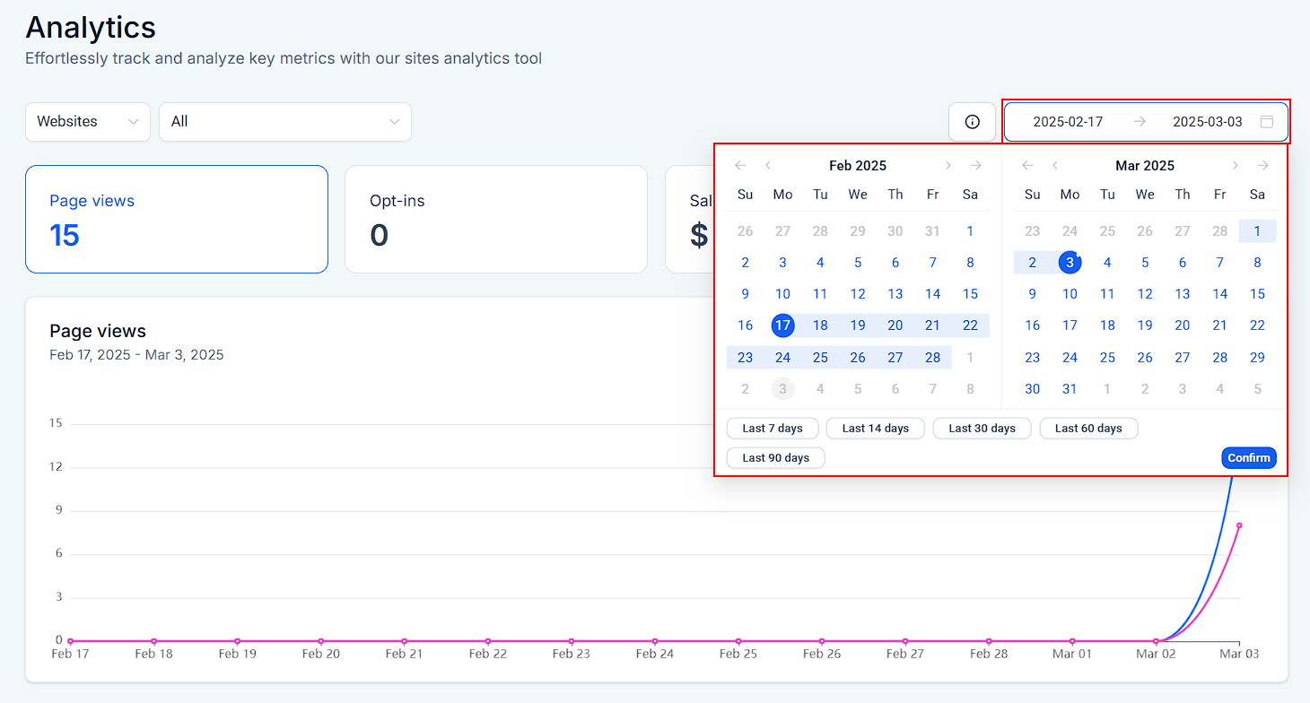 Select a date range with the date picker to view analytics within your chosen time frame.