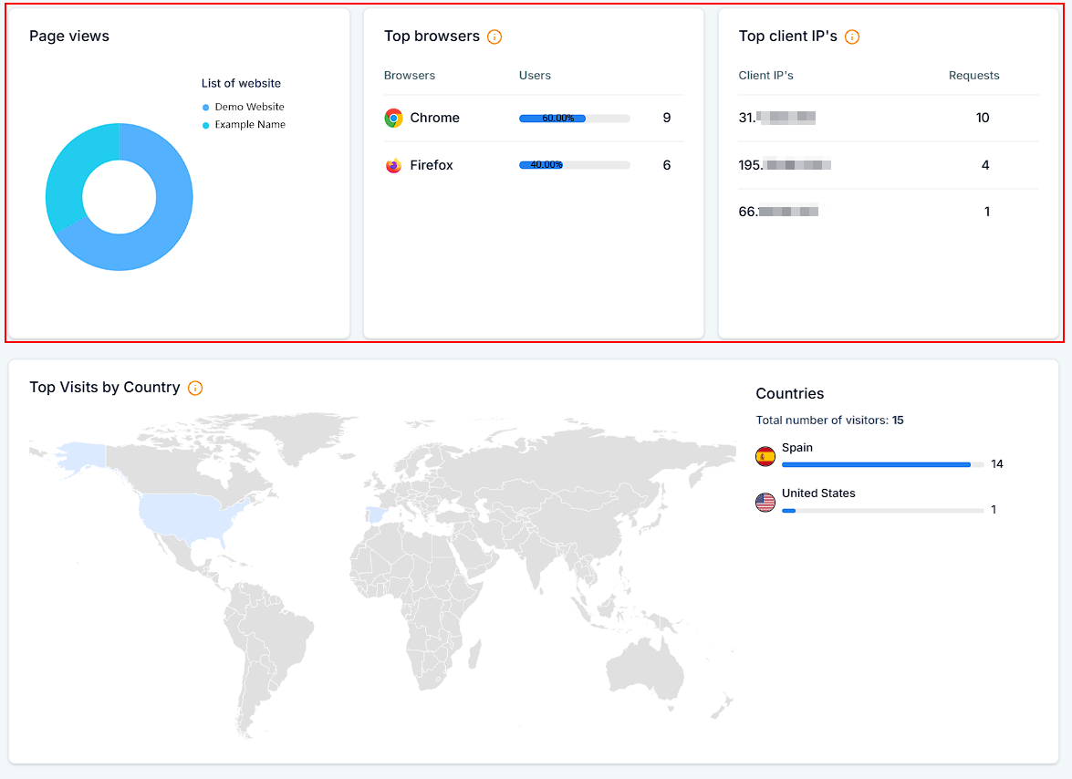 - Top Client IPs: Track the top 10 IP addresses accessing your site. This helps you identify unusual traffic patterns—whether it’s a loyal user returning or suspicious bot activity.