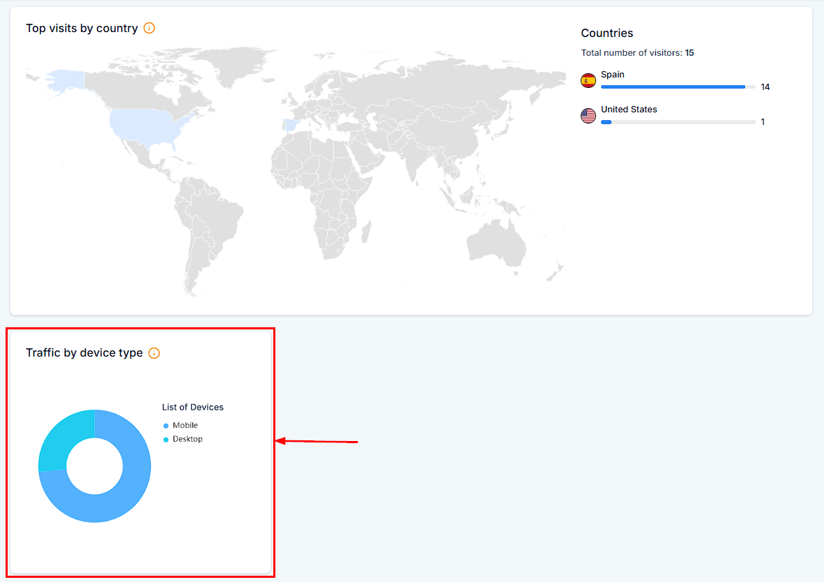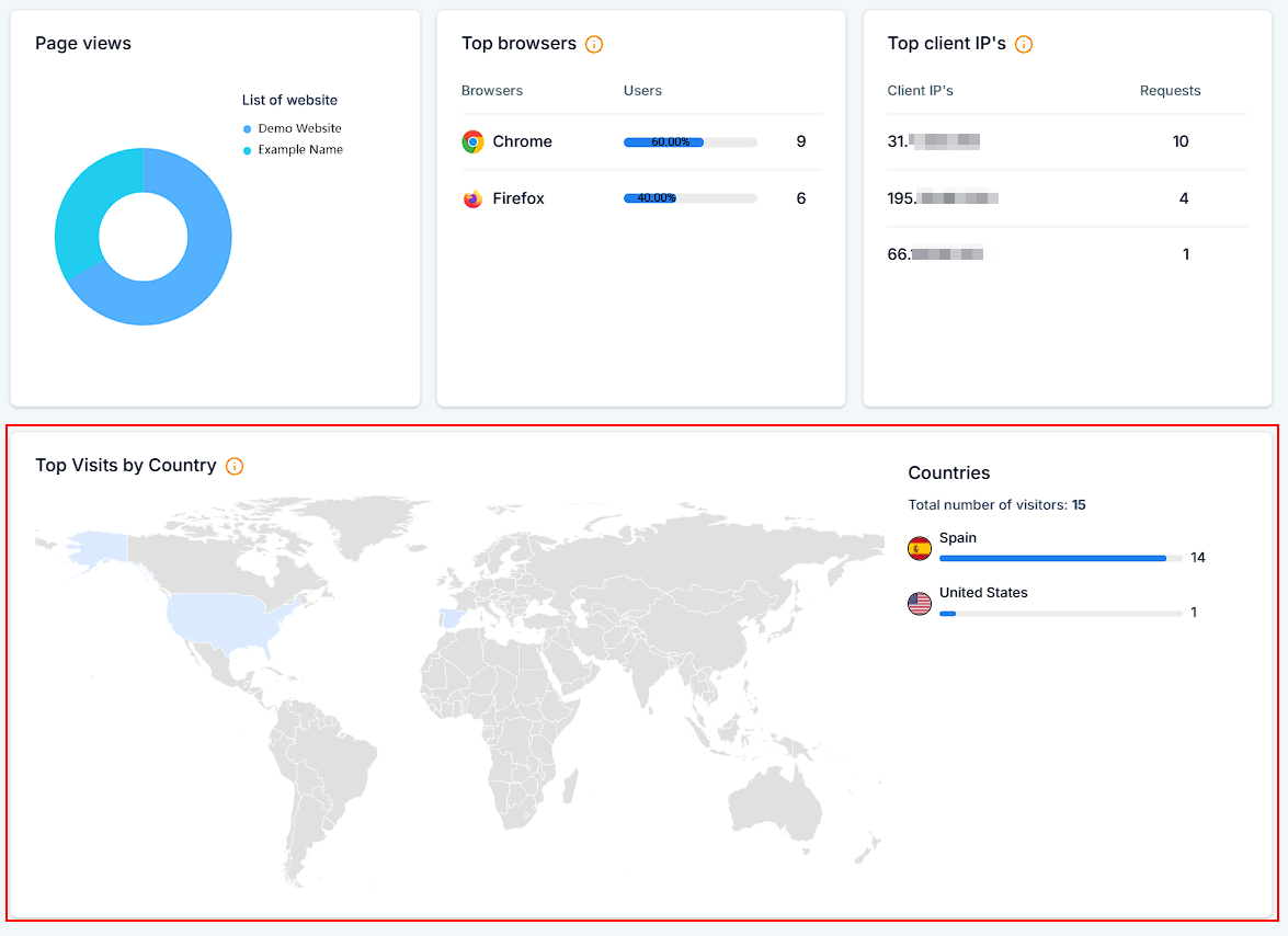 - Top Visits By Country: Instantly see which countries drive the most traffic to your site with a global heatmap view. Here, you can identify trends and optimize marketing strategies based on high-traffic regions and detect unusual spikes in traffic to determine if they’re organic growth or unexpected surges.