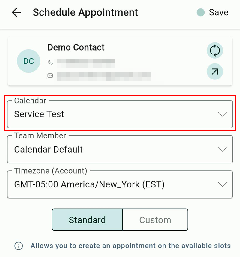 Once you have identified your contact, choose a service calendar you created on the web application from the calendar dropdown.