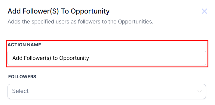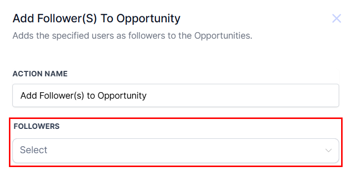 The Add Follower(s) to Opportunity action enables the assignment of one or more users as followers to an existing opportunity, allowing these users to receive updates and notifications about any changes related to the opportunity.