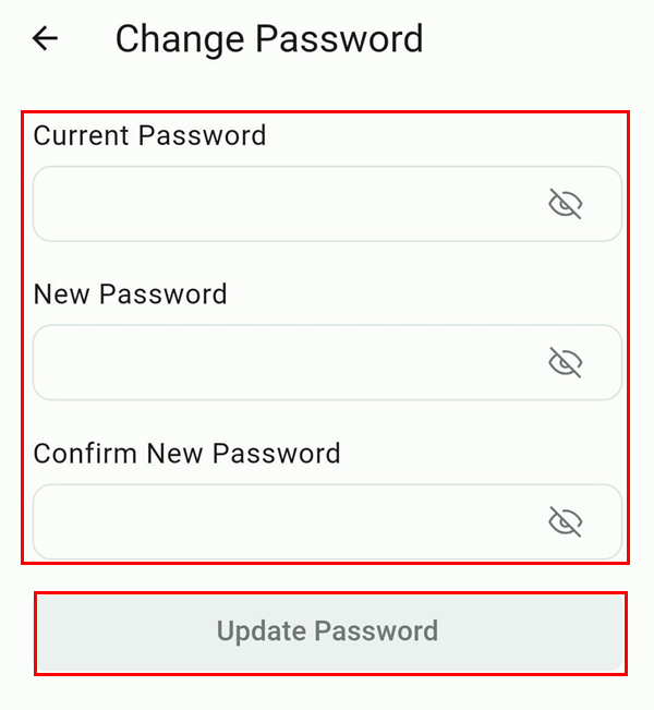 Enter your current password and set a new password. Tap Update to save your changes when complete.