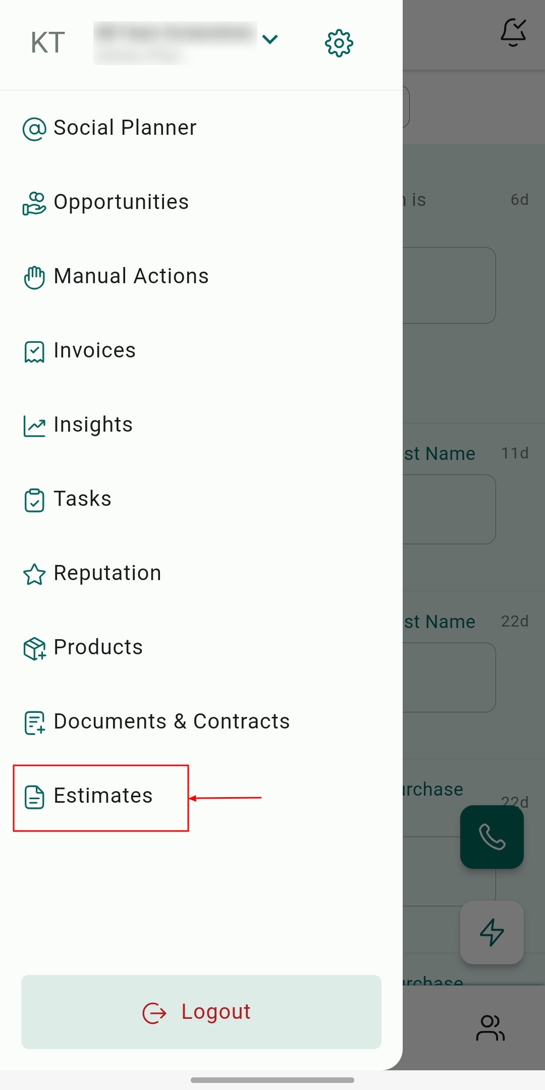 To begin, open the mobile app and log in with your preferred account. From the left-hand navigation drawer, head to the Estimates section.