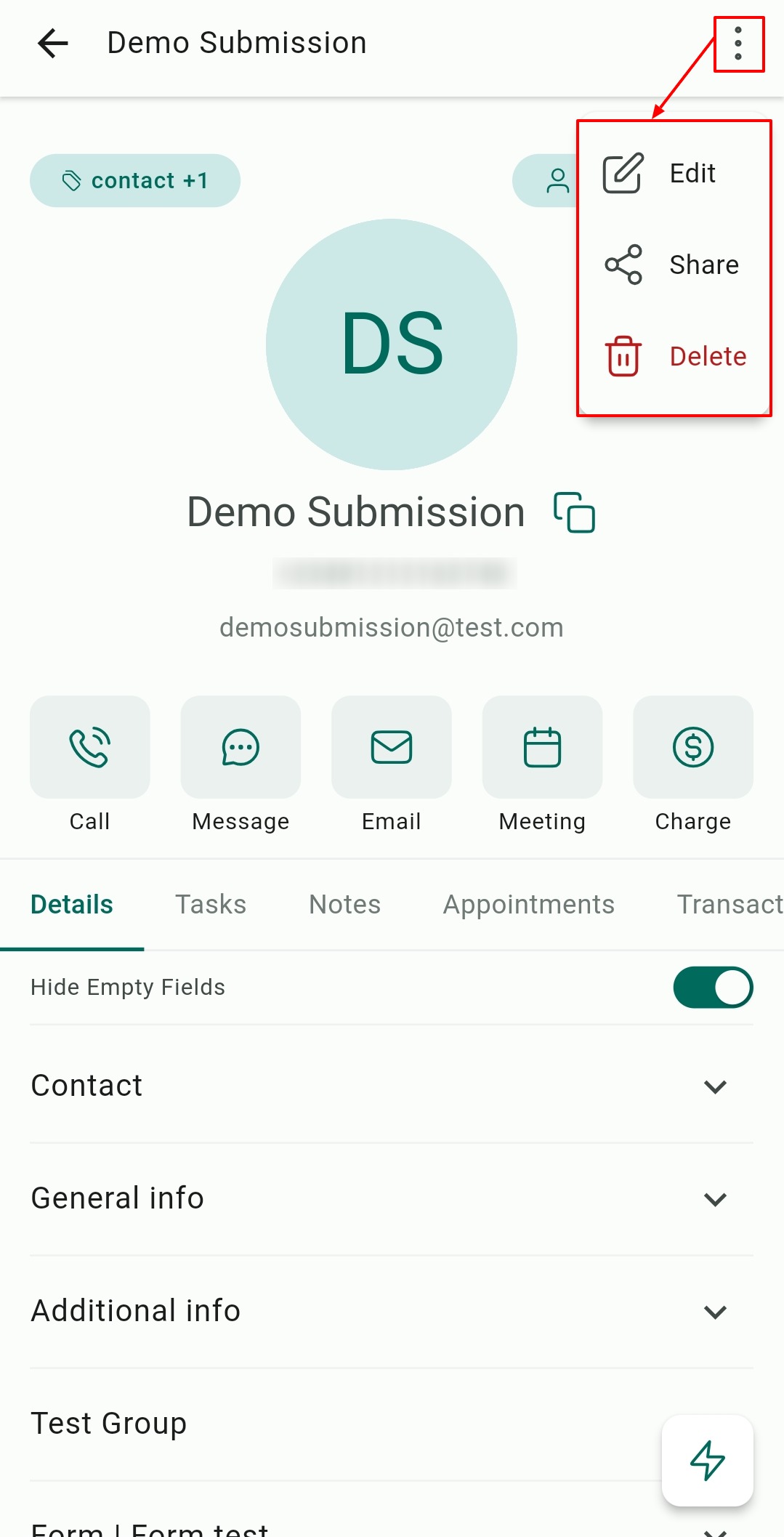 Click the three-dotted button to quickly Edit, Share, and Delete contact.