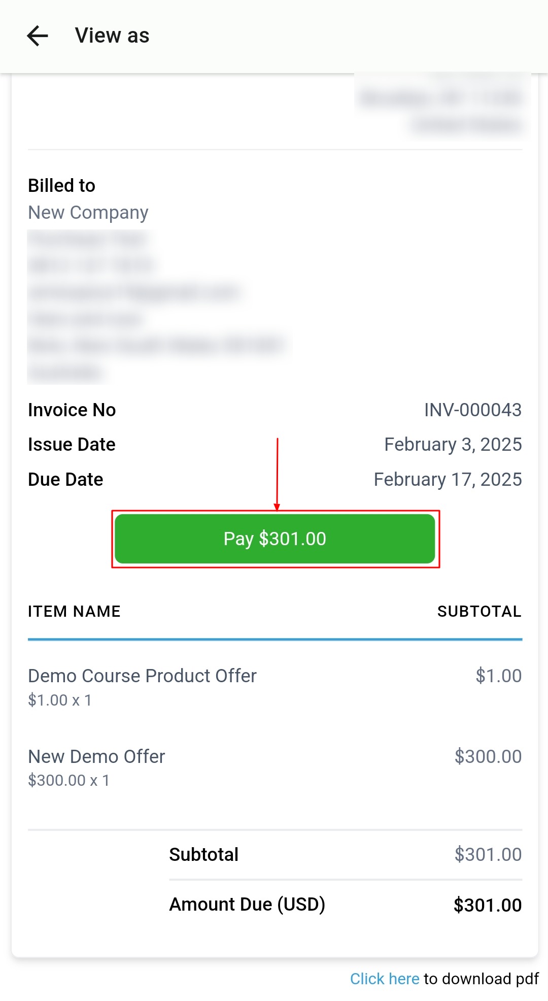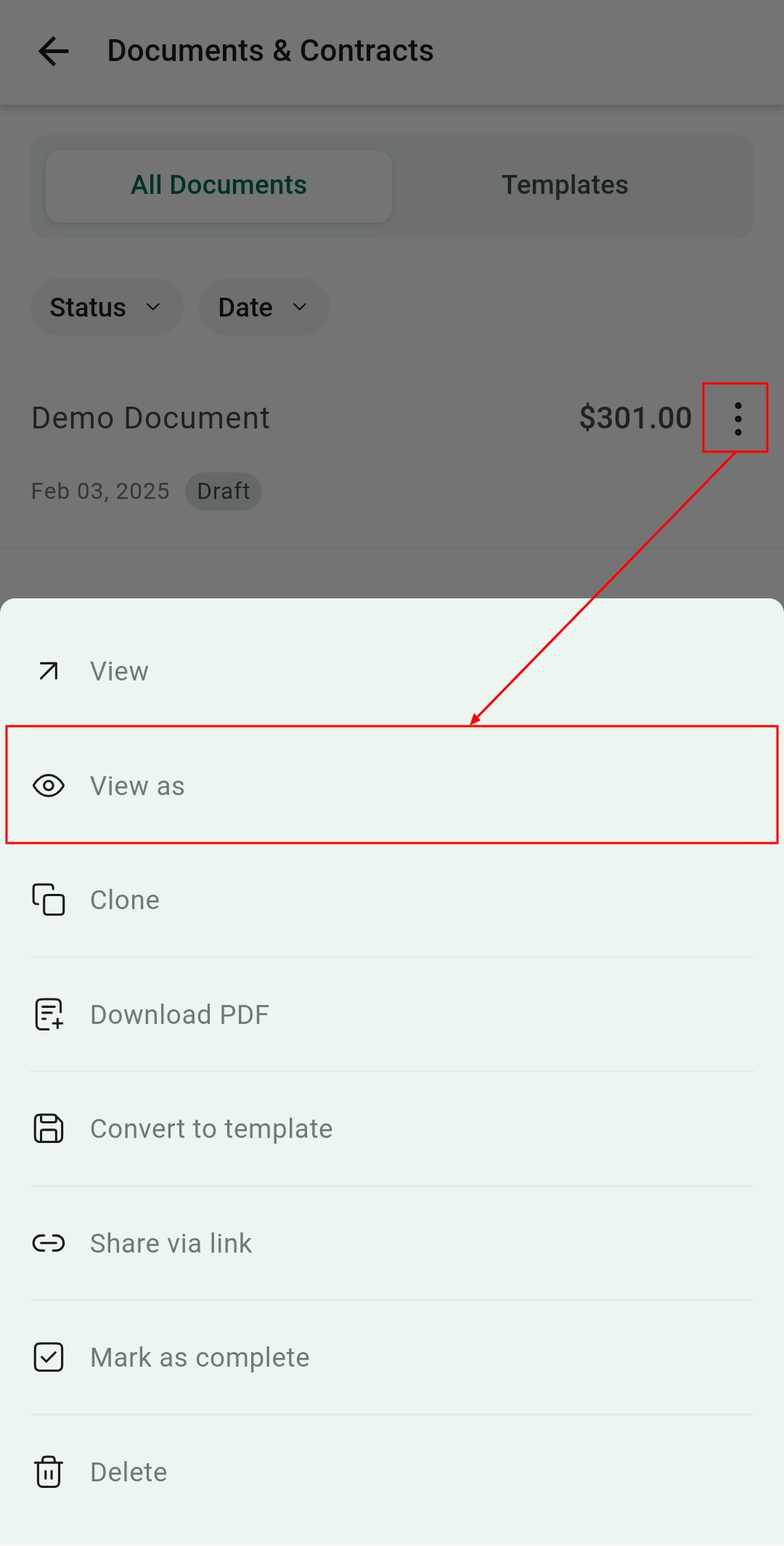 To record a signature, tap on the three-dots icon on the right side of the document tile. From the dropdown menu, select the “View as” option.