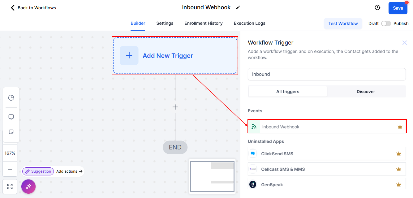 Start by clicking on +Add New Trigger, in the side menu search for and add Inbound Webhook as your trigger.