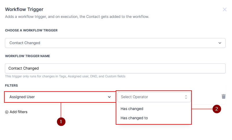 The Contact Changed workflow trigger activates whenever specific details of a contact—such as Tags, Assigned Users, Do Not Disturb (DND) status, or Custom Fields—are updated. This feature automates actions or notifications to keep your team informed and ensure efficient contact management.