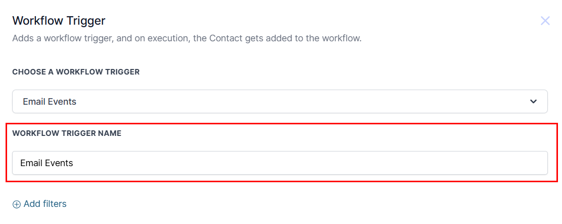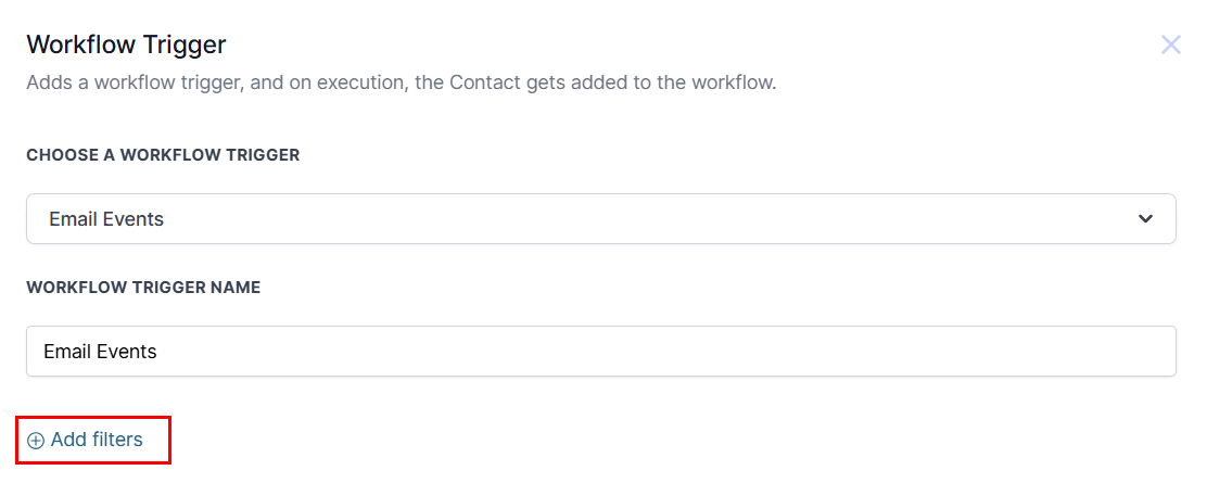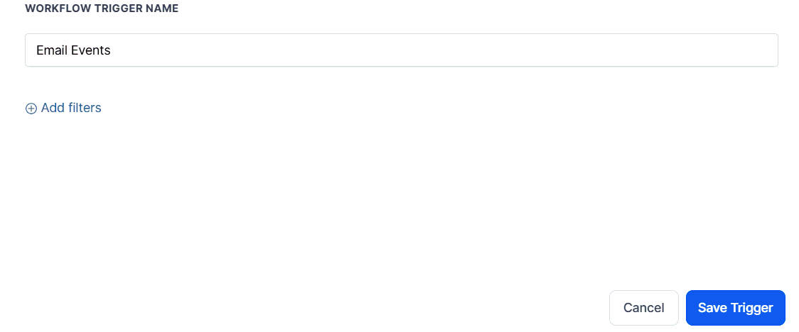 Add filters to choose the event that will fire the workflow, or limit the trigger to only retrieve data on emails within a particular workflow.