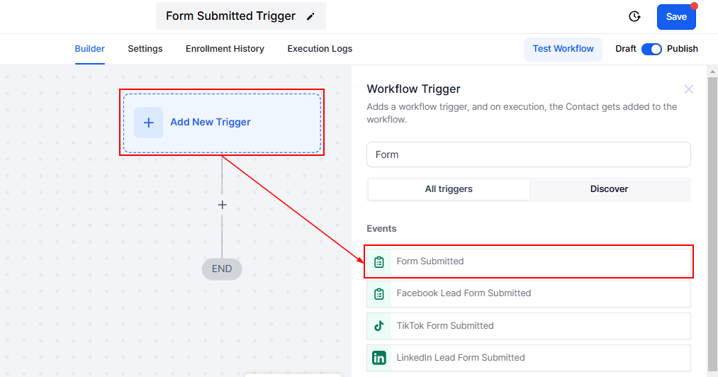 To get started, click on “Add New Trigger” and select and select Form Submitted.