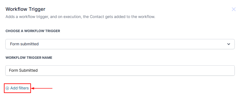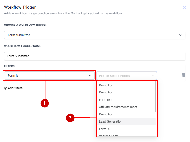 Click the Add Filters button and select “Form Is” from the dropdown. Then in the second dropdown select a form from the that you’d like to use to trigger your workflow.