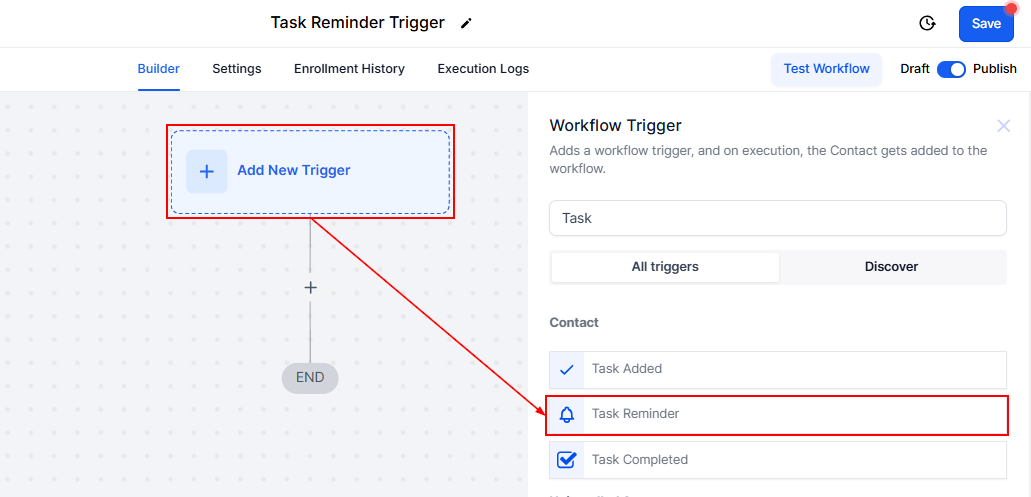 To begin, click “Add New Trigger”, then search and select Task Reminder Trigger.