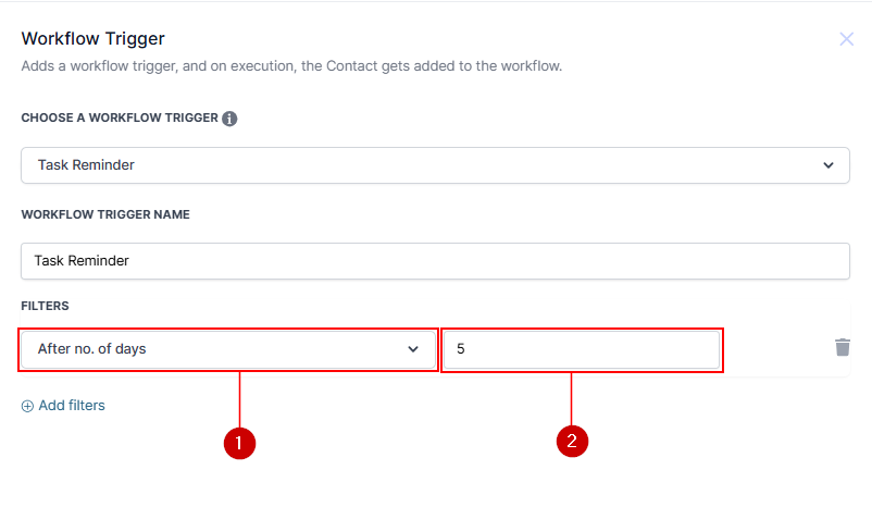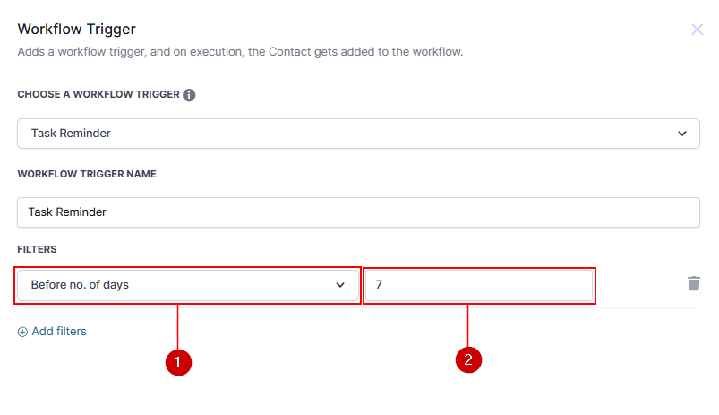 To add a filter, click on the Add Filters button. Here you can trigger the workflow before or after several days or even based on custom fields.