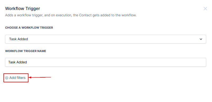 The Task Added trigger is utilized when there is one or more actions to be carried out after a task is created in the system. Depending on the task requirements, additional filters can also be added.