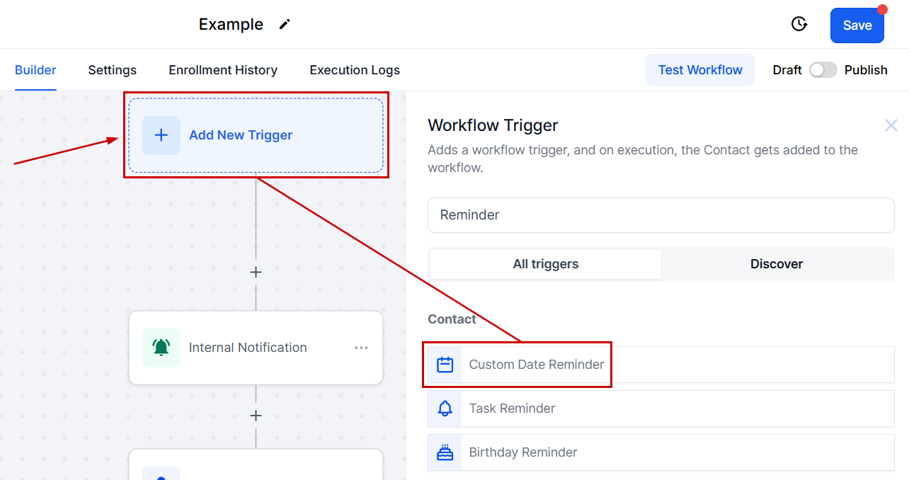To begin, click on Add New Workflow Trigger, and select Custom Date Reminder from the dropdown menu under Choose a Workflow Trigger.