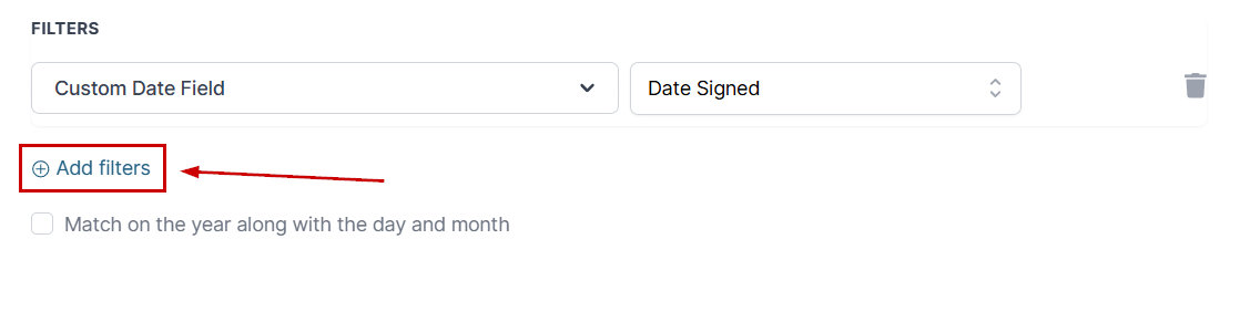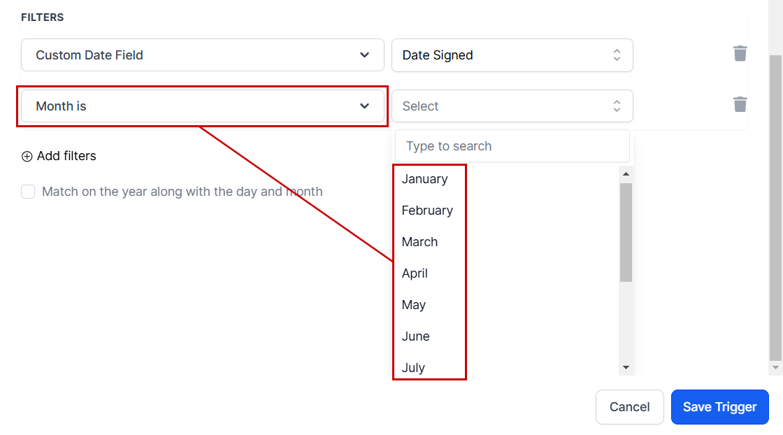 This triggers the workflow on the selected month. You can use it in conjunction with the Day is filter or simply keep it alone to trigger on the first of the month.