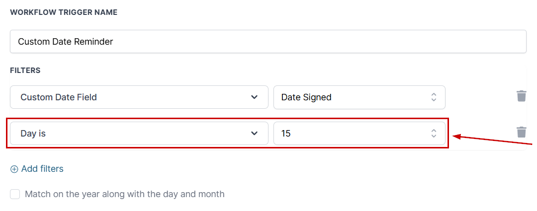 Selecting the Day Is filter lets you select a specific day in the month, like the 15th or the 1st to trigger your workflow. Perfect for monthly subscriptions!