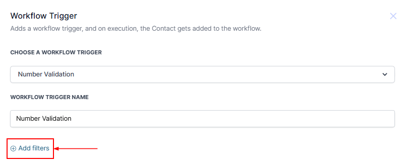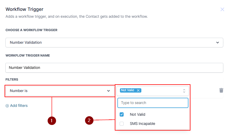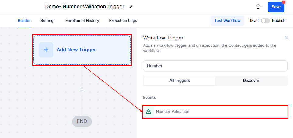 To begin automating your response to these errors, you'll need to set up a new workflow trigger, click on “Add New Trigger”, search, and add the Number Validation option.
