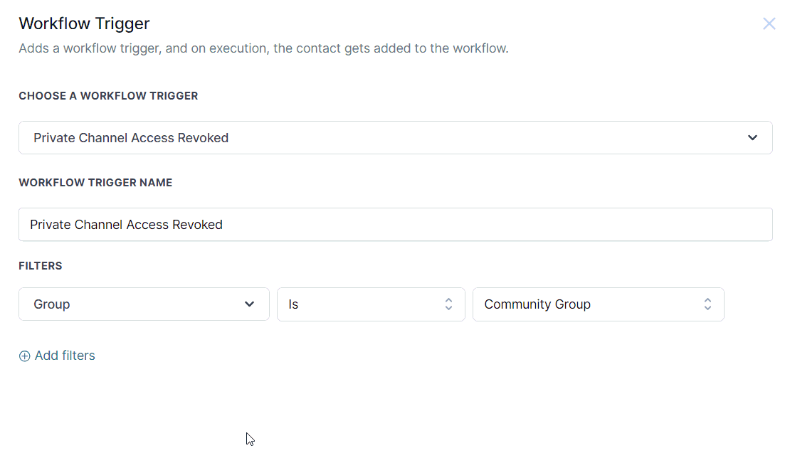 The Private Channel Access Revoked Trigger allows you to automate processes based on a user losing access to one of your Community Private Channels such as sending follow-up emails, notifying team members, or revoking their access to another channel.