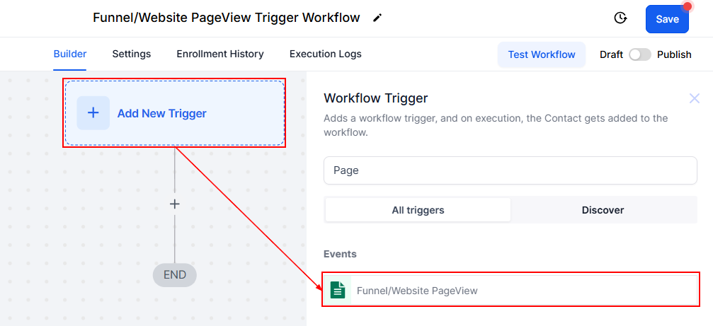 Within the workflow builder, click the "Add New Trigger" button and choose the "Funnel/Website PageView" option from the provided selections.