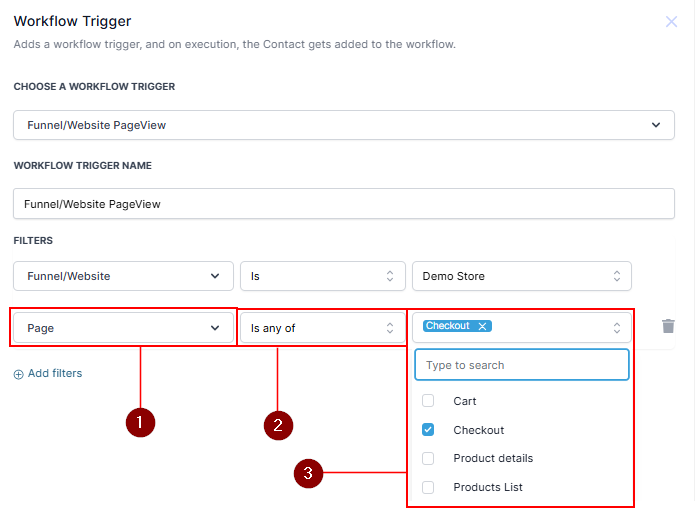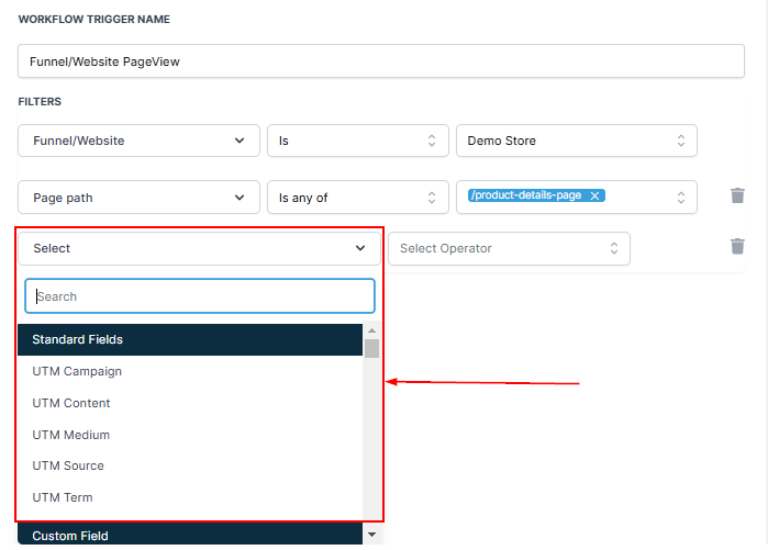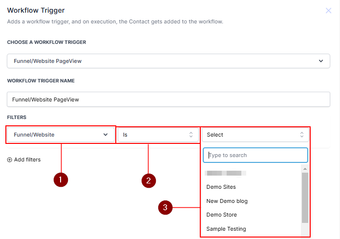 Once the trigger is selected, you will choose the filters starting with the Funnel or Website. This will fire off the workflow once a contact has visited the funnel of your choosing depending on the filters you've selected.
